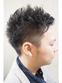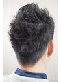 サイドからバックにかけガッツリ刈り上げ、前髪はクセを活かし少し長めに。+αメガネを添えればインテリスタイルです。(笑)