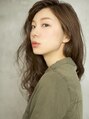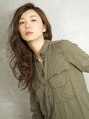 流し前髪を立ち上げたクールフェミニンなくせ毛風スウィートロング☆重めスタイルなのに、透け感の出る秘密はヌーディなアッシュカラーの透明感!ランダムカールがグラマラスな印象を!大人かわいいリラックスウェーブ!耳かけスタイリングも簡単☆