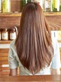 ロングでもあまり強くウェーブをかけてしまうと雰囲気がかなり変わるもの。毛先のみのカールでこなれたカジュアルを表現。斜め前髪が大人の雰囲気も出しました。カラーは流行りのベージュ系ブラウンでツヤ感と動きを同時に演出。