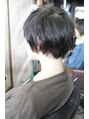 癖があるので艶をテーマにコンパクトなマッシュヘアにカットしました。梳きバサミを全く使用しない、ドライカットを全くしないのがポイント。カラーは白髪があるのでコバルトアッシュのダークトーンで仕上げました。