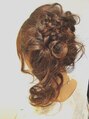 トップにボリュームを持たせ、片サイドから編み込んで左にまとめ上げました。結婚式、二次会、パーティーにオススメ。前から見ても後ろから見ても華やかで人気なスタイルです!