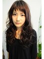 前髪が印象的な、ロングスタイルです。表面や顔周りにレイヤーを入れ、黒髪でも重くならない様にカットしています。切り込んだ前髪と毛先の柔らかいパーマが、大人可愛い印象をアップさせてます。