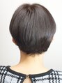 全体的に重めのボブ。襟足はギリギリ刈上げにならない長さまでカット。カラーはスモーキ-アッシュ。伸びて来ても目立たないよう暗めのトーンに。