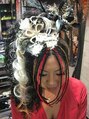 スパイラルや特殊系などなどスペシャルメニュー盛りだくさんスタイル。ヘアカラー黒・人工毛スパイラル70本・前髪ブレイズ・右寄せセットアップ・グラフティー虎笹・オリジナル髪飾り。