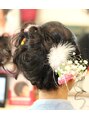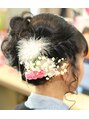 低い位置にポイントをつくったアップは、おしとやかな雰囲気が着物にもドレスにもマッチします。シンプルでも地味にならないのはラフな質感をあわせて今風にしているからと生のお花を飾りに使ってるからです。柔らかな印象を一層際立たせてくれます。