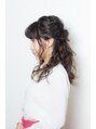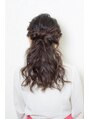 全体を波巻きしてから、顔まわりの髪を残して上の方から後ろに向かってねじります。後ろは逆毛をたてて、高さを出しながらゴムで結びます。ねじった横の髪を途中から編み込みにしてゴムを隠すようにとめ、くずしていきます。下の髪はバランスよく巻きます。