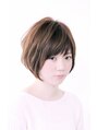 斜めバング、厚めバングに設定し、小顔に似合わせカットでナチュラル&ゆるふわで大人かわいいヘア。かきあげスタイリングでボリュームショート。伸ばしかけの方も黒髪の方にもピッタリ。少し伸ばして艶感ボブ、リラクシーな感じにも変化しやすいです。