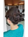 肩ぐらいの長さのミディアムヘアー。派手になりすぎず、地味すぎないスタイル。結婚式のお呼ばれやお子様の卒業式にいかがでしょうか?