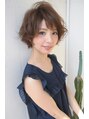 ショートバングが愛らしい前下がりショート。丸みのあるフォルムと、毛先のランダムな動きが、リラックス感を演出。カラーはベージュ系で透明感をプラス。