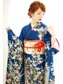 結婚式やパーティーに!ダークブルーの地色に梅の柄が渋めに入っている、かっこいい振袖です。髪型もシックにまとめています。