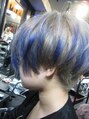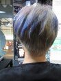 カットは刈り上げショート。カラーはグレージュ。毛先にブルーメッシュを入れてます。