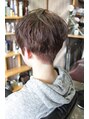 襟足に強い生え癖があるので襟足のみソフトかりあげ。サイドに向かって長め、フロントも眺めがおしゃれポイント♪カラーは男性でもあえてのレッド系をチョイス!