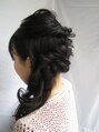 卒業パーティー、結婚式二次会、入学式などにおすすめのツイスト左寄せハーフアップでございます。前髪は眉下シースルーバングでカット。