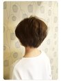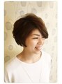 ショートスタイルにポイントパーマして大人っぽく♪片側は耳にかけてアシンメトリー風ショートに。ラベンダーアッシュのカラーを入れて、落ち着いた柔らかいイメージにしました。