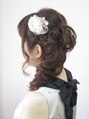 サイドに編み込みをいれてのサイドアップに♪大きめのカールで。トップは、少しボリュームだして