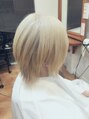 人生で一度は<白髪にしたい>というお客様のご要望に応えるべく全頭ホワイトブリーチを2回施しました。ペールイエローの状態から13トーンのプラチナホワイトベージュを被せて外国人風ホワイトカラーを表現しました。髪型は王道ショートレイヤースタイル。