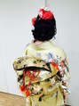サイドのカールのきいた髪が可愛らしくフレッシュです。トップはふんわり高さを出して、サイドはねじってまとめました。着物に合うセットです。