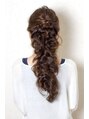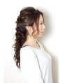 全体をゆるく波巻きした後に、編み込みやねじりを入れながらまとめました。ハーフアップよりも大人っぽい雰囲気になります。逆毛もほとんど立てないので髪のダメージが気になる方にもおすすめです。