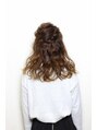 全体をミックス巻きした後に波巻きを組み合わせてランダムなカールに。上の方はボリューム感ある編み込みでハーフアップにしています。