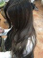 プリン風グラデーションカラーです。トップ付近は5トーンのダークアッシュに。根本塗布後に、毛先は10トーンのプラチナアッシュを被せて透明感を際立たせました。