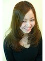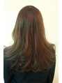 ワンレンベースの表面にだけレイヤーが入ったスタイルです。8レベルのアッシュ系ブラウンのカラーリングで透明感が出るようにして、毛先に太めのロットでパーマをかけました。