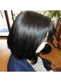 朝ブローしても午後にはくせが出て、毛先がはねてしまいます。月に一度白髪染めをしていて、中間から毛先にかけて乾燥していて硬くなっています。全体にカラー専用の保護剤をタップリつけて、施術しました。