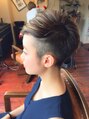 サイドからバックにかけて刈り上げをし、フロントを長めに残しパートをしっかりつけ流した、スタイリッシュモードスタイル。モデルの骨格が一番きれいに見えるところにウェイトを設定しました。カラーはあえて根元を暗くし、奥行き感を演出。