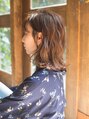 鎖骨レングスのロブスタイル。ハイライトが細かく入っていて全体をグレージュカラーに染めています。前髪は眉くらいでやや短め、流すと眉毛が見えます。表面にレイヤーが入っているので重さの中にもふわっと感と動きが出ます。
