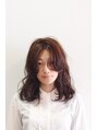 セミロングのパーマスタイルです。全体的に大きなウェーブを。バングは長めに設定しています。目にかかるうねるバングがより雰囲気を演出してくれます!邪魔なくらいのバングと無造作に動く質感で抜け感を!