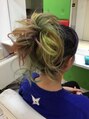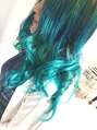 上から全てターコイズだとかなりインパクトが強いので黒髪からのグラデーションで毛先には濃いターコイズをのせました。色落ちの最中もとてもキレイです。