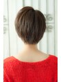 前下がりの耳かけショートスタイルです。トップにボリュームが出にくい方にオススメです。カラーはイノセントカラーで透明感と柔らかささらに上品さをプラスして。