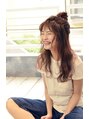 ゆるーくまとめてお団子にしたハーフアップアレンジです。手ぐしで上下にざっくり分け結び目に髪を巻きつけピンでとめます。