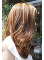 フロントにスライジングと言う染め方の施術で陰影をつけ、前頭にハイライト・ローライトをウィービィング。クールでスタイリッシュ、ロングで魅力的な雰囲気に^ー^