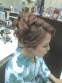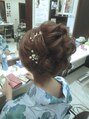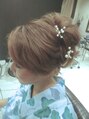 襟足をスッキリ上げて、バックにボリュームたっぷりのカールをたくさん作り、フロントは大人女子っぽく少し立ち上げて、サイド、トップとなじませてゆるっと流しまとめました