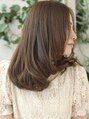スッとした印象のIラインシルエットスタイル。毛先には動きが出やすいようにレイヤーを。丸みや空気感などの甘さも控えてシンプル&ナチュラルヘア。カラーは8トーンのアッシュベージュを全体に塗布。38ミリのコテでゆる巻きに