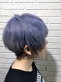 ネープを刈り上げショートにカットし、ベースをかなり明るくしてから、ブルーアッシュ、パープル、シルバーなどで調合した微アルカリカラー剤をON。