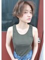 ハイトーンカラーの大人ショート。ブリーチカラーでミルクティーグレー、セピアアッシュカラーをONします。赤みを抑えながら透明感とツヤを出します。緑っぽくなりすぎないのがポイント。クセっぽいパーマをかけてこなれたショートに。