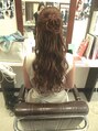 トップは軽く盛りバックでまとめお花を作りました。下ろした髪はグリグリ巻くのではなくではなく、ゆるく波ウエーブとミックス巻きを混ぜながら巻きました