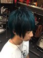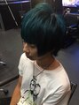 V系ショートにカット、前髪はややM字全体は深めのグリーンにブルーを少し混ぜ右サイド下に黒のポイントカラーを入れてます!