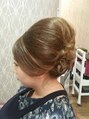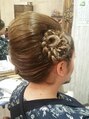 夜会をベースに流れすじと毛先アレンジで人とかぶらないスタイルにしました。ポイントにサイドにお花を作りました。