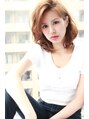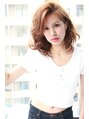 Aラインシルエットのミディアムスタイルです♪ ラフなパーマでボリュームを出し、前髪を横から立ち上げて顔を小さく見せる効果アップ☆ カラーはシンプルな明るめのアッシュ系で◎