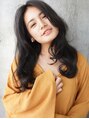 黒髪、もしくはモノトーンアッシュのロングウェーブ スタイル。レイヤーで動きを出しウェーブをつけ、センターパートにスタイリングすることでロマンチックなフォークロアの雰囲気を。