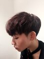 カットは2ブロック刈り上げマッシュショート、女性らしい可愛さも残しつつカッコよさも引き出す。赤ベースのカラーに前髪ローライトで小顔効果抜群。