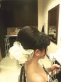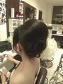 全体的に丸いシルエットがお好きなお客様。トップ、バックにたっぷり梳き毛を入れてボリュームを出し面で整えてまとめました。右側ネープ部分にご持参頂いた大きなお花の飾りバランスよく左ネープ部分にカールをチラしてみました。