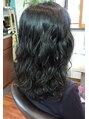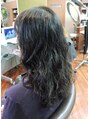 全体にしっかりかけたパーマが印象的なスタイル。通常より長いロッドを使用し、根元から毛先まで均一なカールでソバージュ風に。カットは梳くとまとまりが悪くなるので、段を入れることによって毛のズレを出して重くなりすぎるのをカバーして軽い印象に。