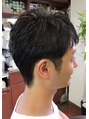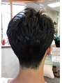ツーブロックショート。アンダーの部分は長めに残して優しい印象に。かぶせる毛も耳はアンダーの部分をカバーできる長さに調節。トップはボリュームを出し、動きがでるように短くして量も梳く。ツーブロックの部分が自然に馴染むように計算されたスタイル。