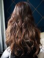 サイドパートで目にかかるアンニュイバングがポイントのウェーブロング。全体的に散りばめたハイライトで透明感と立体感を!耳かけスタイルにするのがオススメのスタイルです☆コテで巻いたようなゆるふわデジタルパーマで意外にもスタイルングは楽チン☆