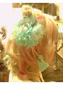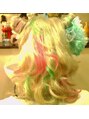 Wブリーチ後にホワイトカラーにして、グリーンとピンクのメッシュをオン。ビビットなカラーリングの組合せで注目度高し!