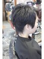 骨格補正カットを施したアシメのベリーショート。黒髪でも動きのあるデザイン。頭の形が綺麗に見えるシルエットと毛流れがポイントのカットデザイン。