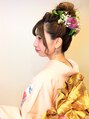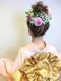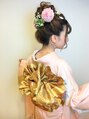 振袖お団子スタイルです。生花を使って華やかに。事前に襟足や毛先にハイライトを入れるとよりアクセントがついて可愛くなるのでおすすめです^^帯結びもリボンアレンジで可愛らしく結びました。